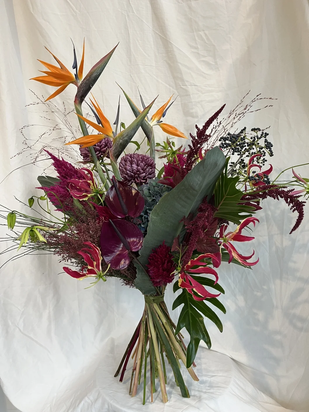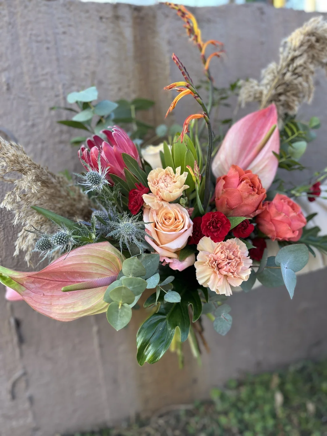 - Połączenie świeżych i suszonych roślin – bukiet często zawiera trawy, eukaliptus, suszone kwiaty i egzotyczne liście.
