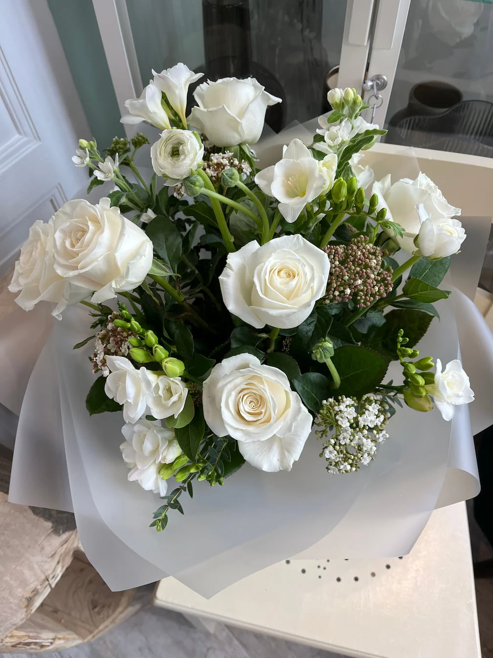 Delikatny bukiet kondolencyjny z białych kwiatów to symbol szacunku, pamięci i współczucia wyrażany w eleganckiej, florystycznej formie.