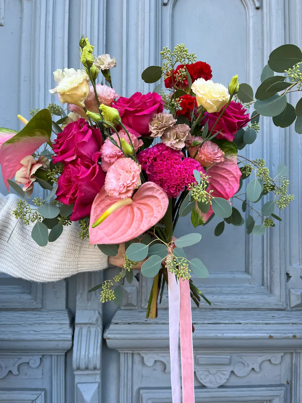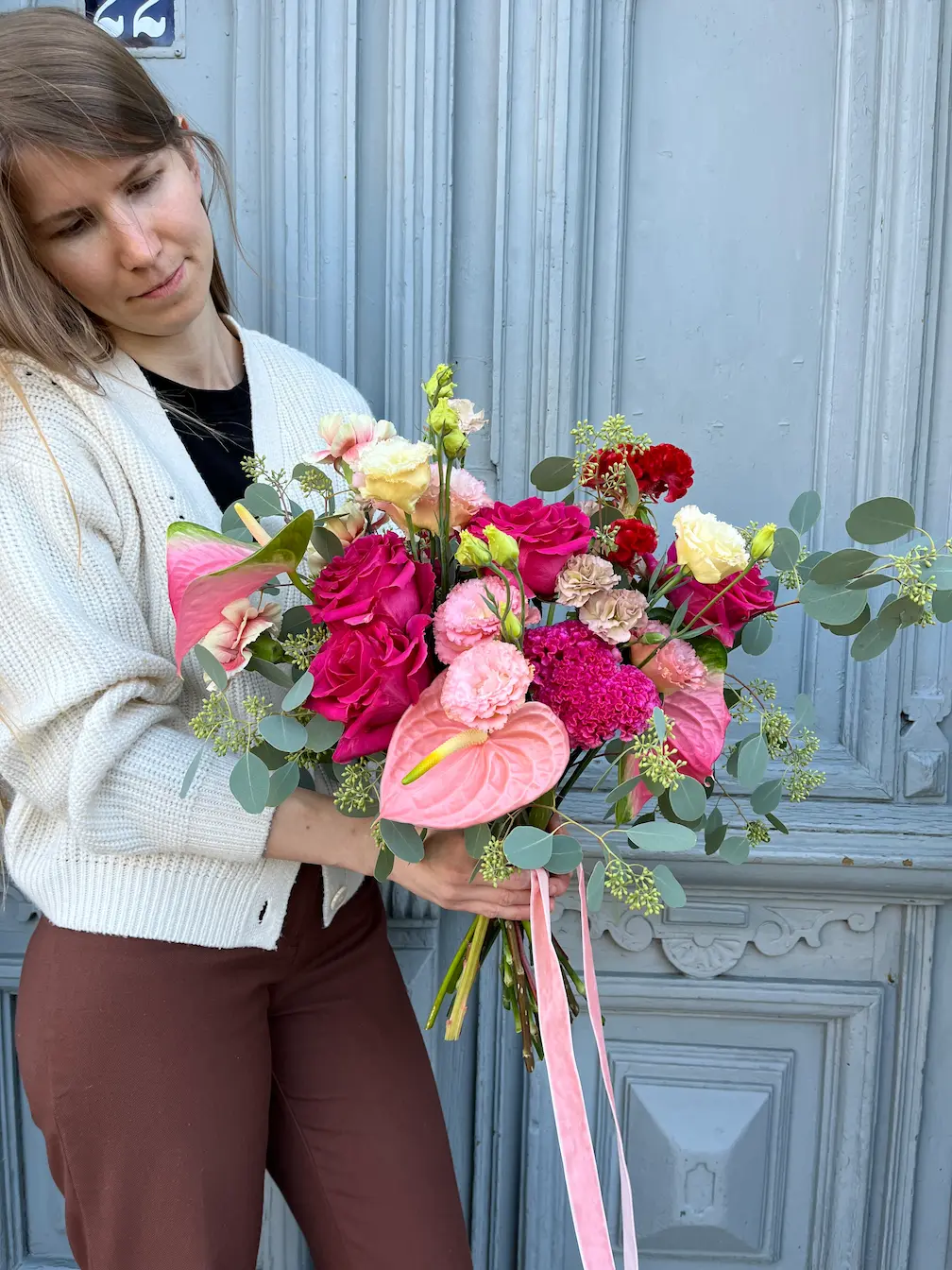 Kompozycja łączy pastelowe i pudrowe odcienie różu z bardziej nasyconymi tonacjami, tworząc bujny, harmonijny i świeży efekt.