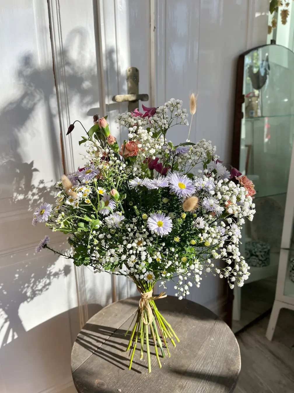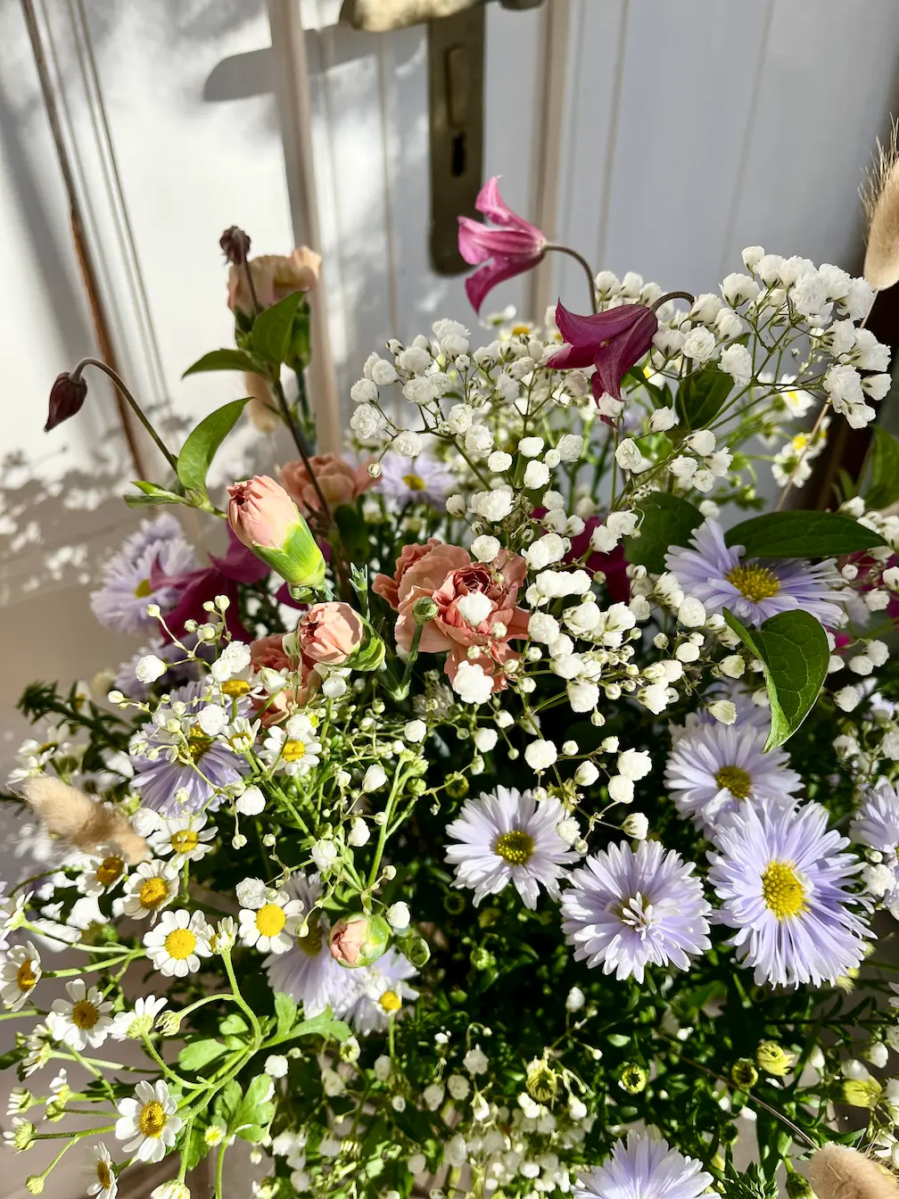 Połączenie klasycznej lekkości gipsówki z wyrazistymi astrami daje kontrast kolorów i faktur, który nadaje kompozycji świeżości i indywidualnego charakteru.