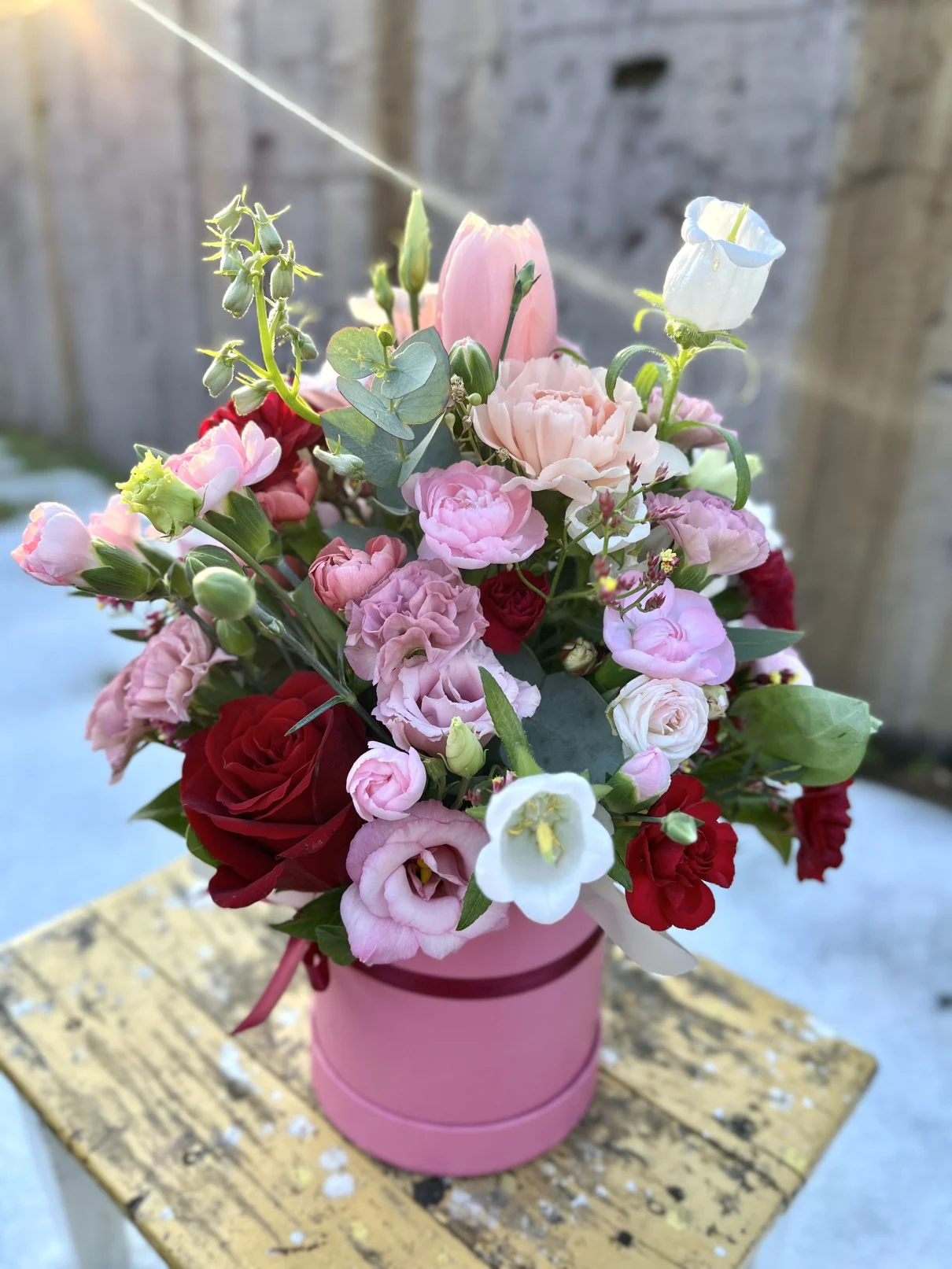 Połączenie delikatnych różowych kwiatów z intensywnie czerwonymi tworzy niezwykle efektowną i zmysłową kompozycję.