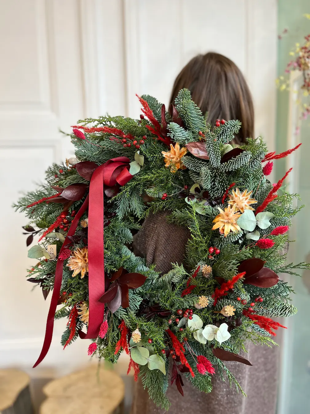 Soczysta czerwień liści i drobne czerwone owoce kontrastują z eukaliptusem i jodłą, tworząc dekorację o bogatym, świątecznym charakterze.