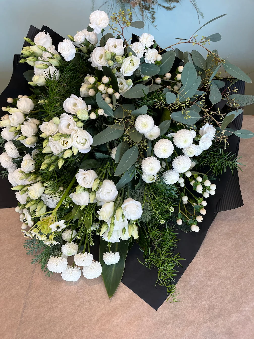 Wiązanka w klasycznej bieli to elegancka kompozycja florystyczna utrzymana w ponadczasowej tonacji białych kwiatów sezonowych.