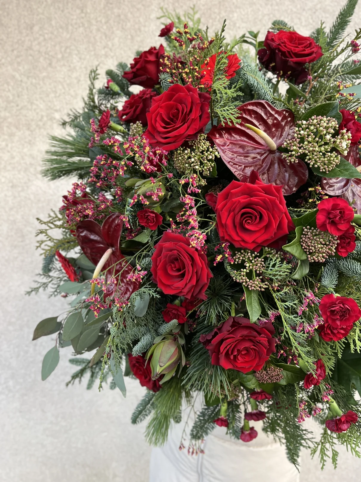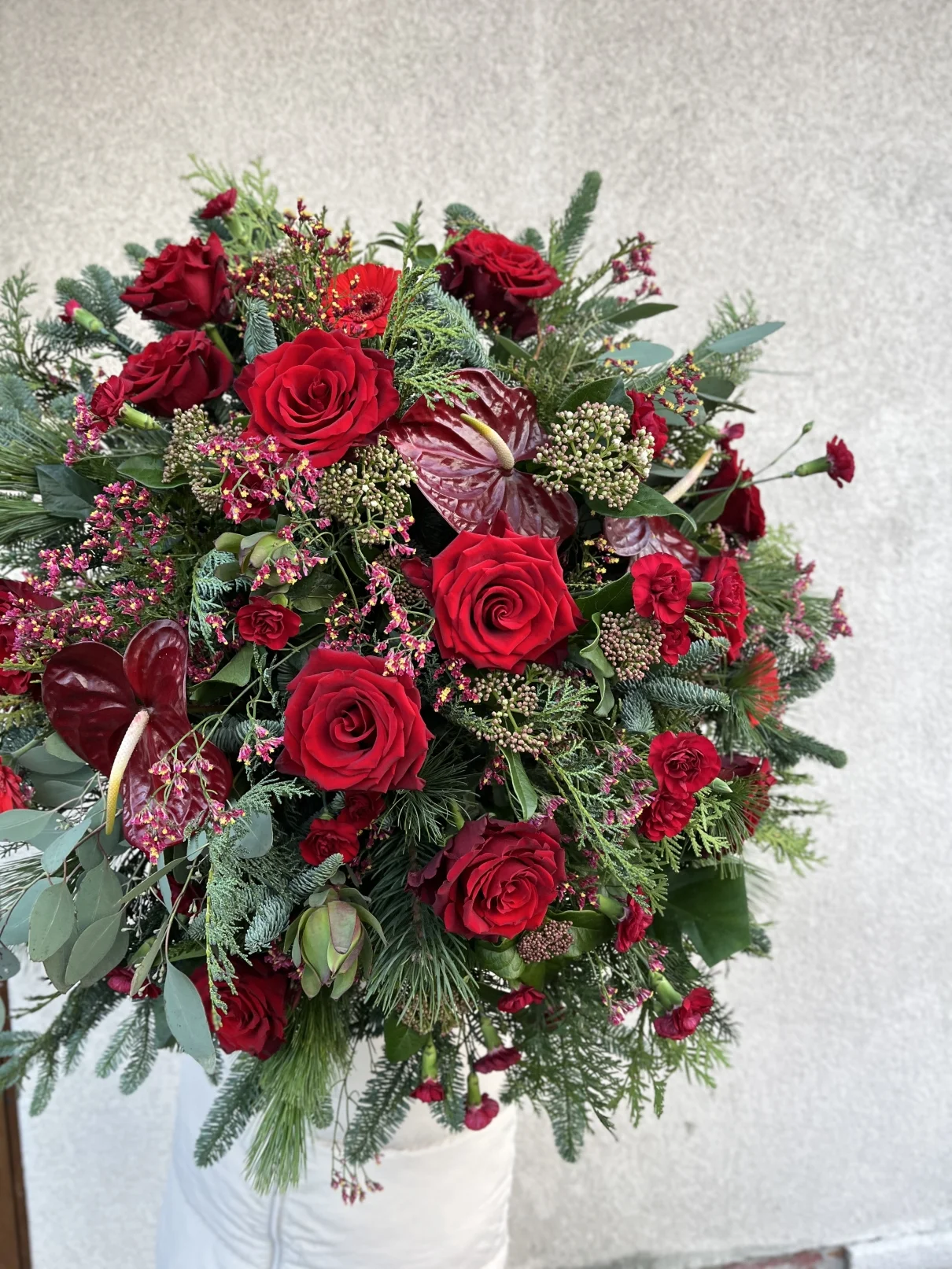 Został skomponowany z wielu gatunków kwiatów w intensywnych barwach czerwieni i bordo, symbolizujących miłość oraz szacunek.