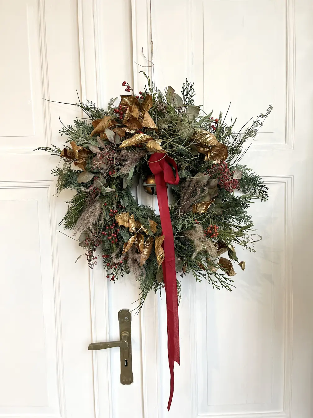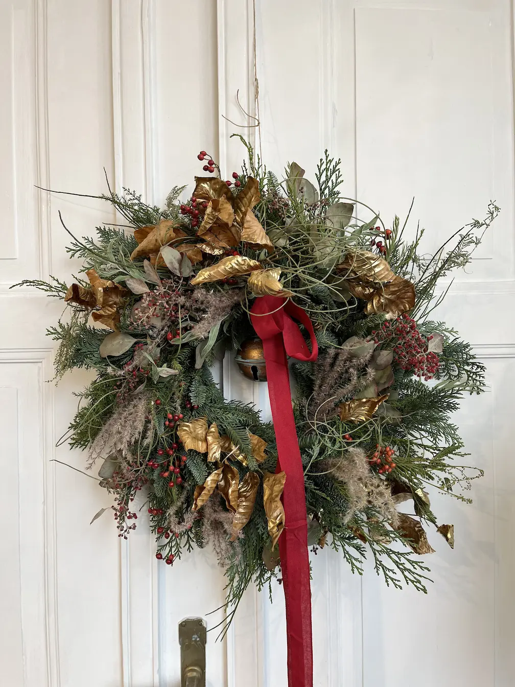 Гірлянда "Різдвяний дзвіночок" - це унікальна, багата композиція, в якій природна зелень ялиці та тису поєднується з золотистим листям, червоними фруктами та м'якими квітковими деталями.